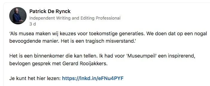 Wat te doen met zeer omvangrijke particuliere collecties. In Vlaardingen gaan we de collectie van Jan Anderson ‘in slaap brengen’ vanuit de gedachte dat onze kinderen en kleinkinderen zo’n verzameling veel beter kunnen op waarde kunnen schatten dan wij nu. De kans is groot dat we achteraf de verkeerde dingen selecteren. We zijn als samenleving beter in ordelijk bewaren dan ordelijk vergeten. Toch gaan we dit laatste doen, vanuit de gedachte dat wat vergeten wordt, uiteindelijk het best bewaard blijft. Zie Erfgoedhuis Zuid-Holland.